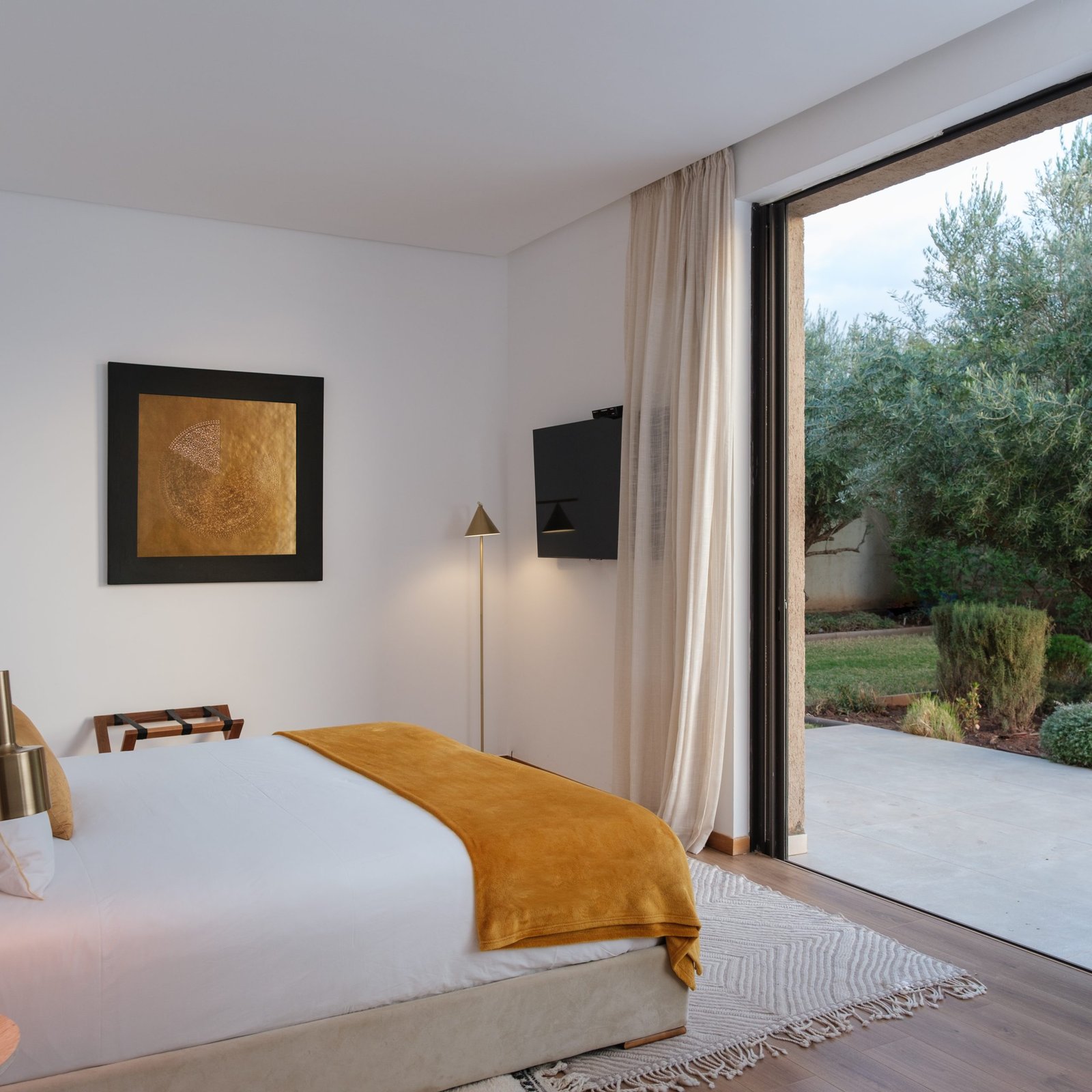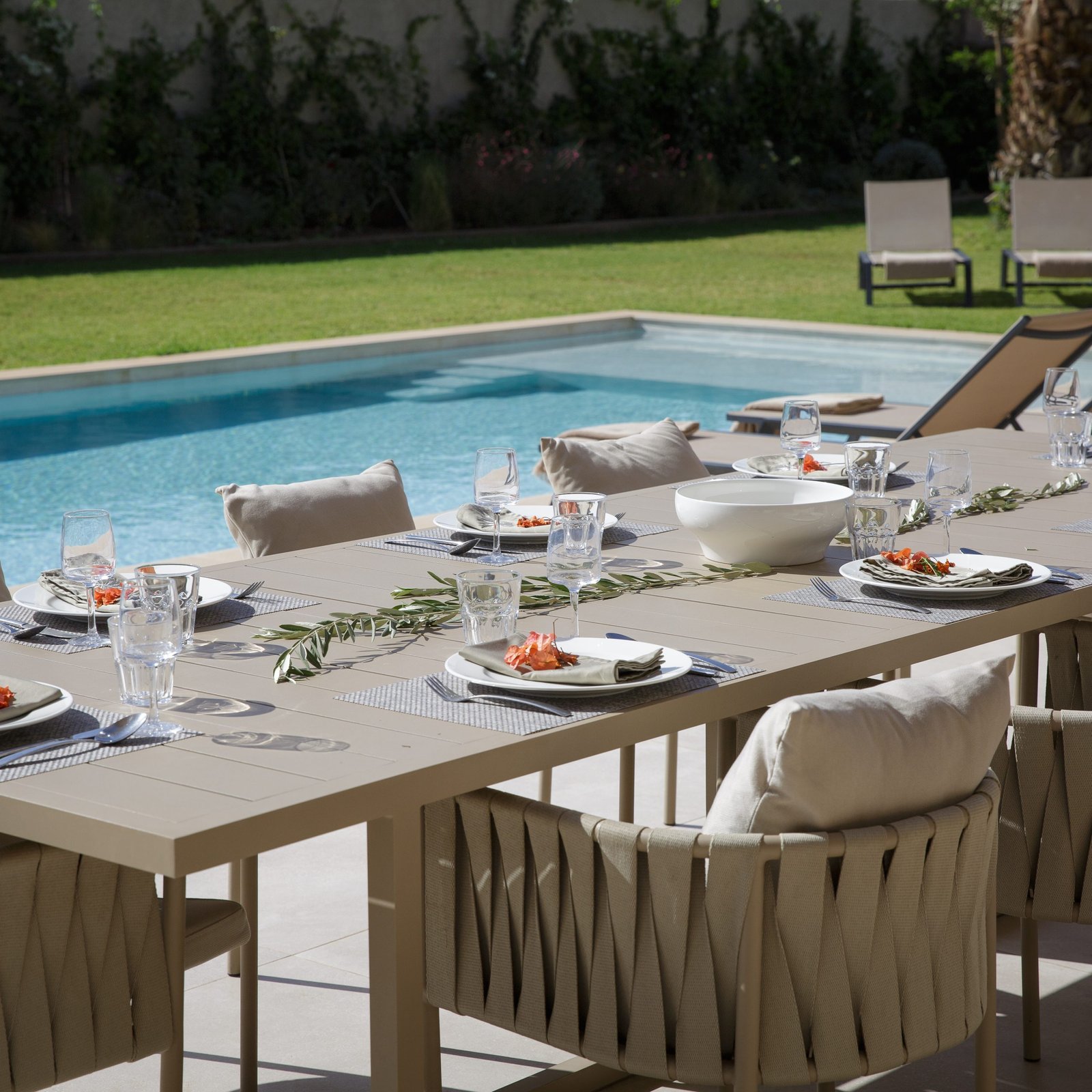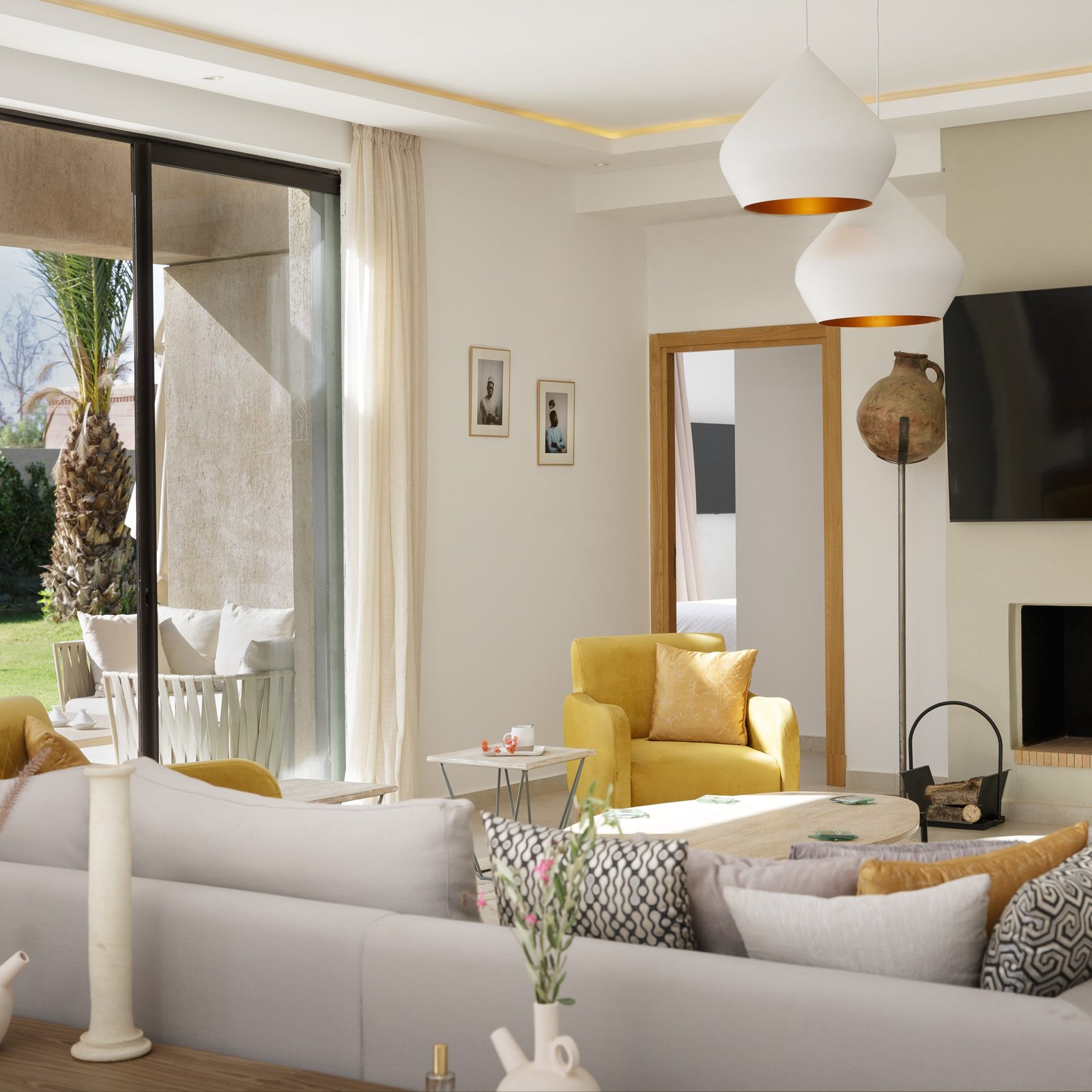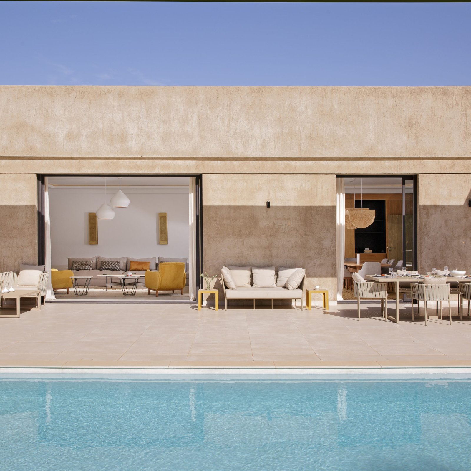À l’extérieur, le jardin et la piscine privée (15 x 5 m) deviennent le centre de la vie à la villa. La piscine est chauffable en hiver, ce qui permet d’en profiter quelle que soit la saison. Une terrasse panoramique (accessible aux adultes) complète l’ensemble, avec une ouverture directe sur les montagnes de l’Atlas.