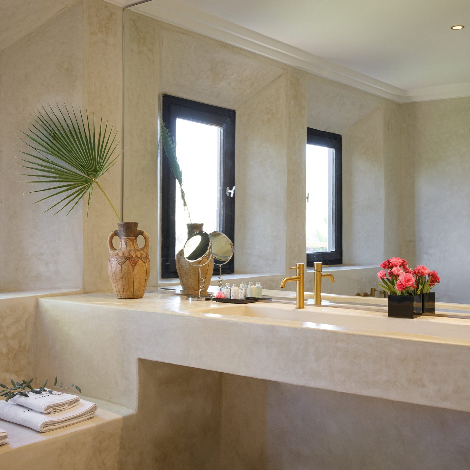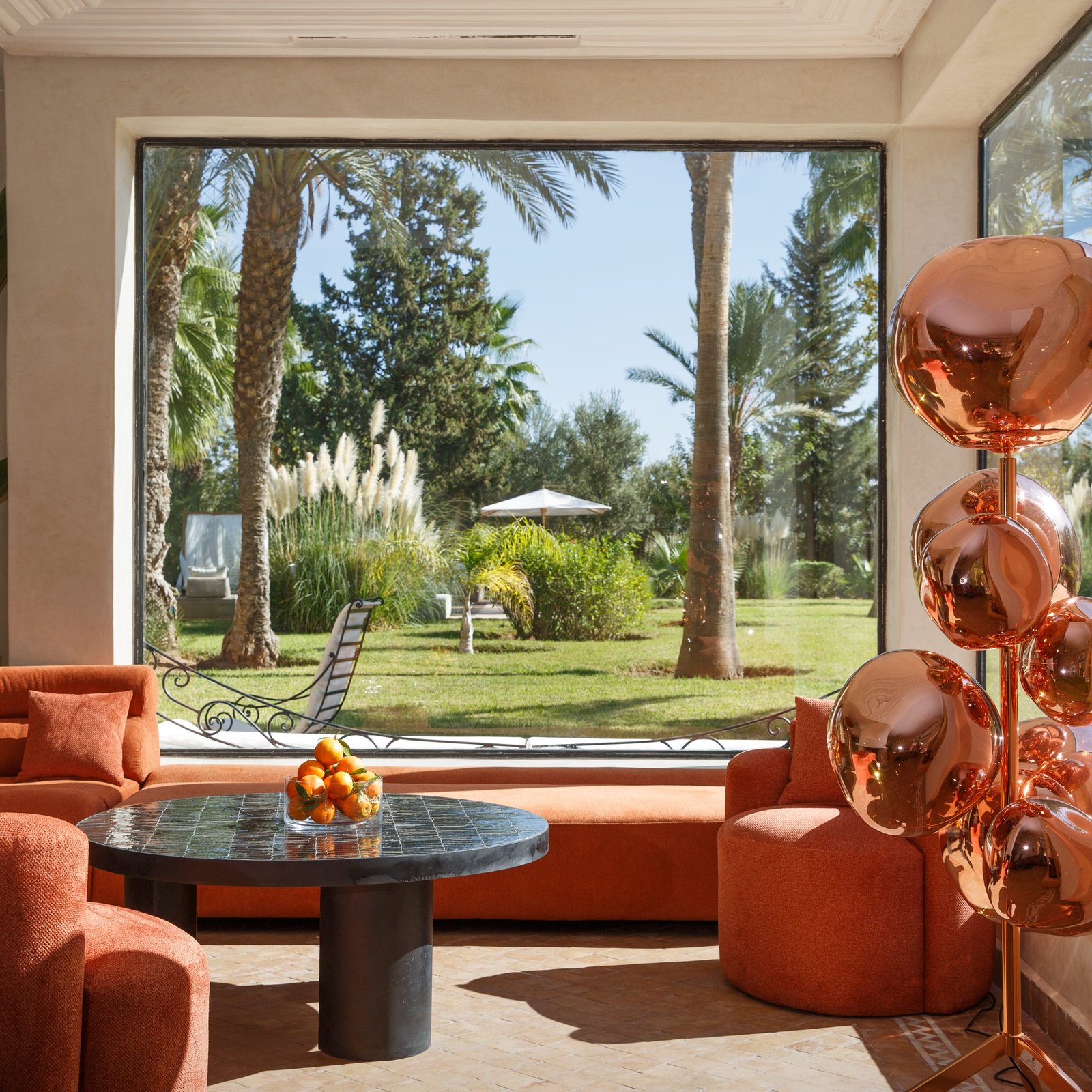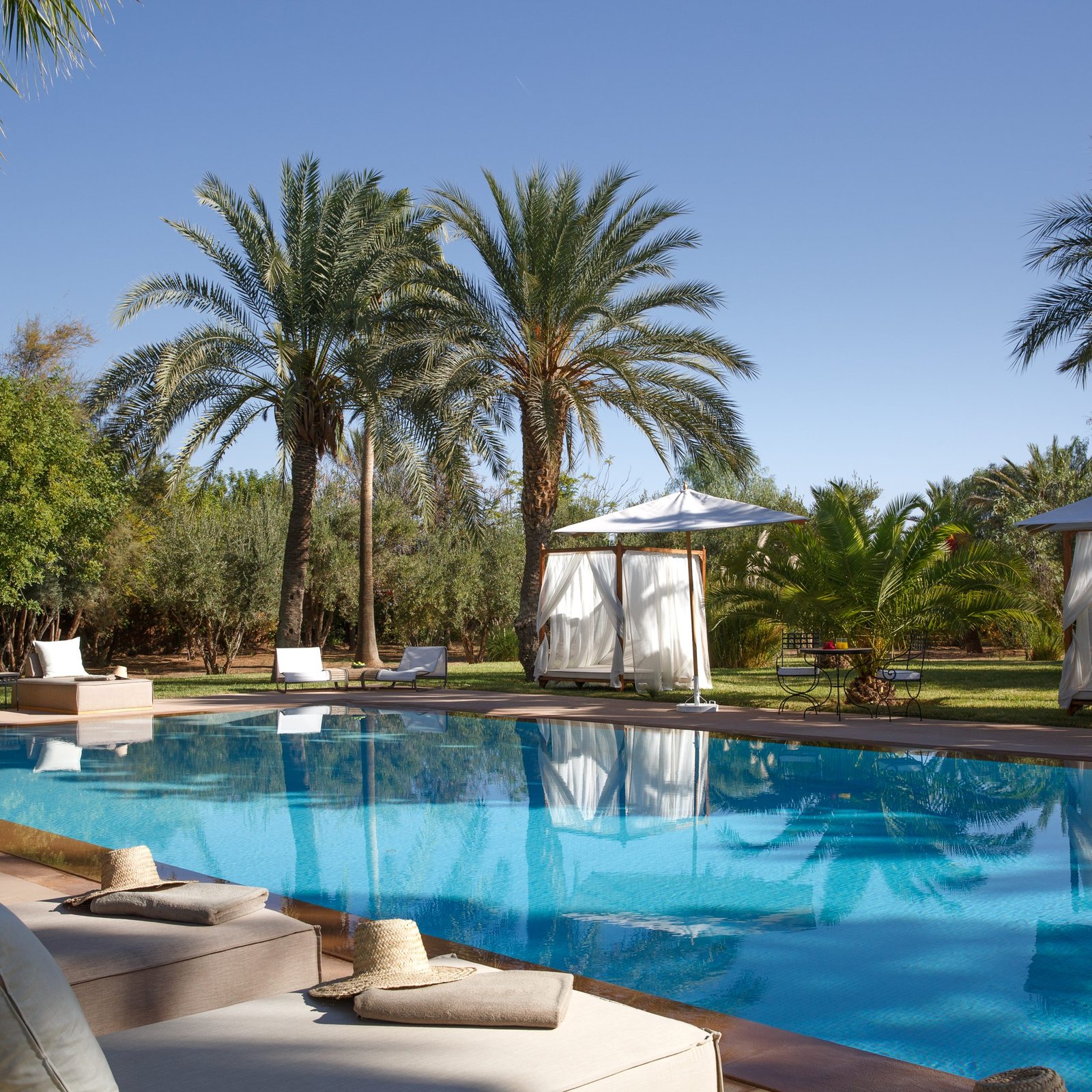 À l’extérieur, la propriété s’organise autour d’un jardin arboré et de superbes terrasses, avec une grande piscine (17 x 7 m) chauffée, agréable en toute saison. La villa bénéficie également d’une vue 360° sur l’Atlas, particulièrement appréciable au lever et au coucher du soleil.
