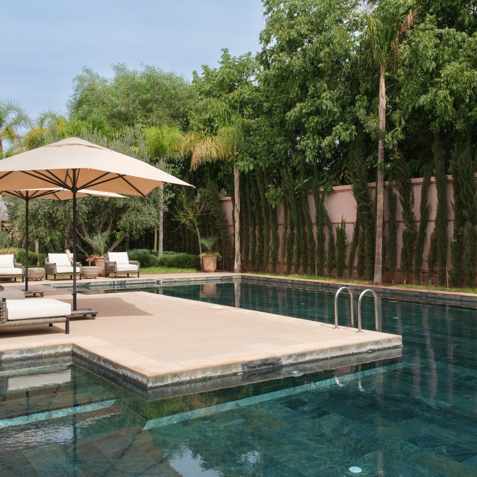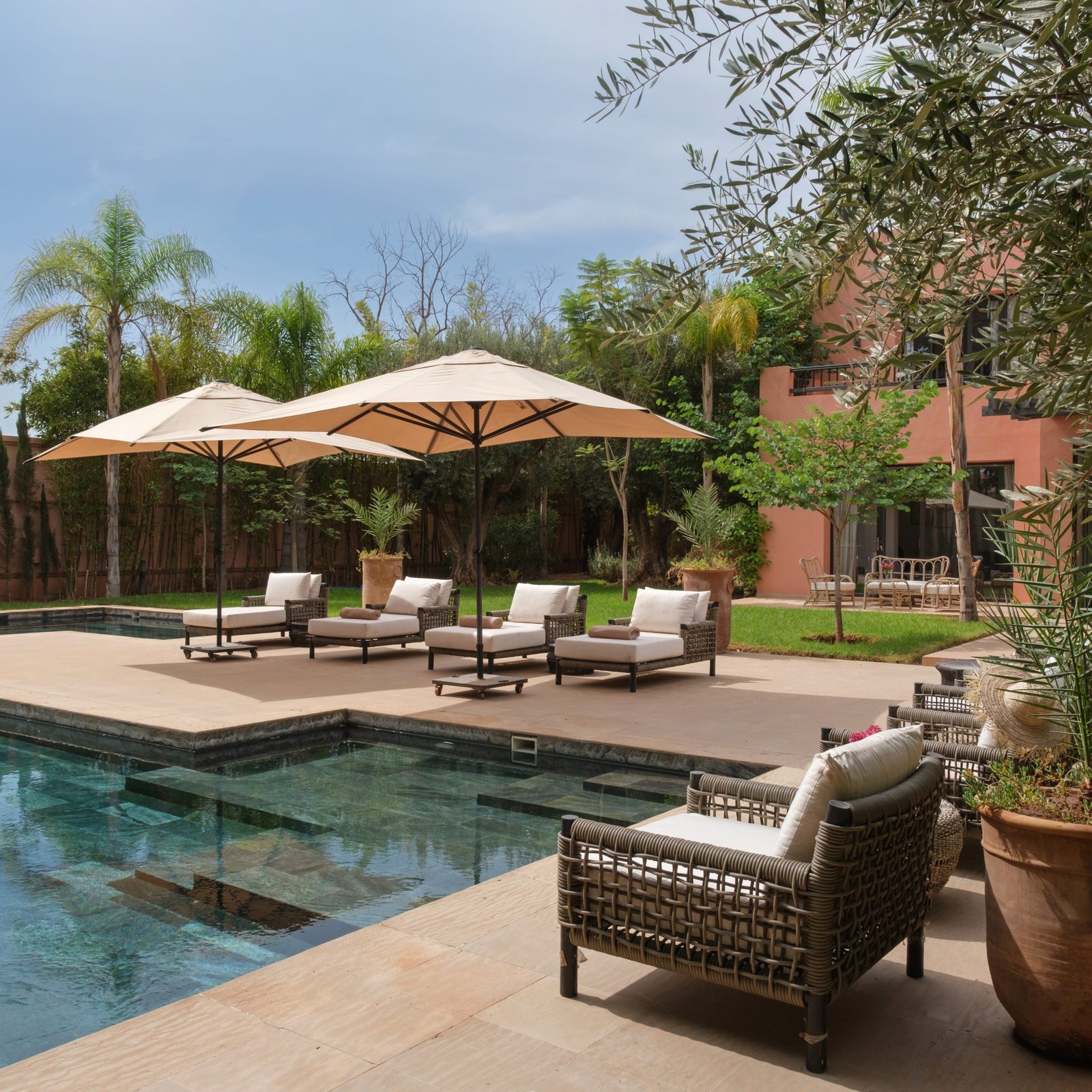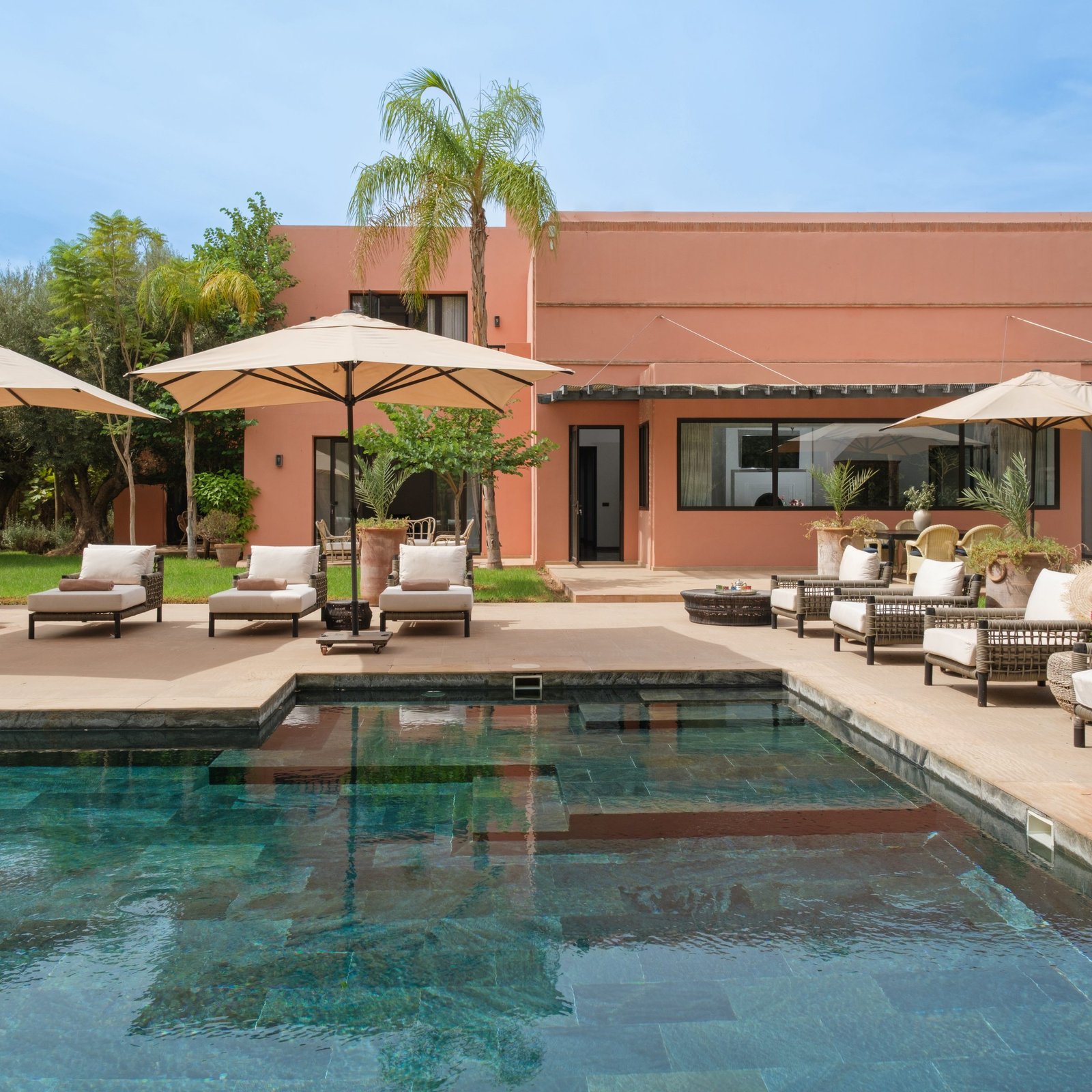 À l’extérieur, le jardin paysager s’articule autour d’une piscine privée, idéale pour profiter pleinement du climat de Marrakech dans une atmosphère paisible et raffinée. L’ensemble a été conçu pour créer une vraie sensation de sérénité, avec un équilibre réussi entre prestations de standing et esprit résidentiel.